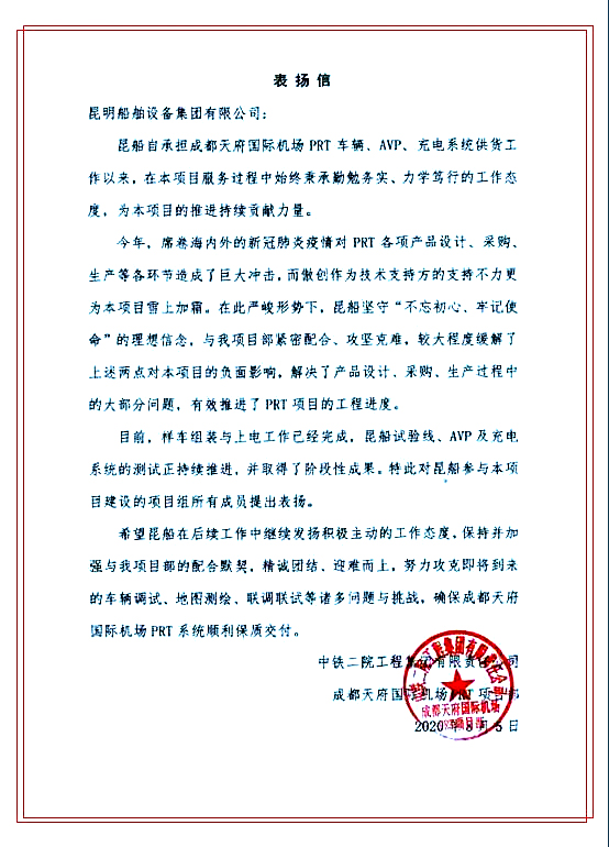 近日,成都天府新機場建設指揮部機電部總經理楊建偉、總包單位中鐵二院副總工程師王利軍等一行,在昆船機場事業部領導陪同下到昆船生產車間全面檢查了PRT車輛生產進度及試驗線建設情況。天府新機場機電部領導現場仔細查看了PRT樣車的整車機電裝配、線束制作、內飾及外觀