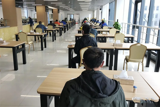 在現場,全天佩戴口罩,7點到21點8次體溫檢測,這一項項防疫措施成為他們每天工作的日常。為減少人員聚集,一日三餐指定一人一桌禁止交談,并且要求錯峰就餐每人半小時就餐時間,有時因工作原因錯過了就餐時間,就只能委托同事將餐食從食堂領出,在工作現場隨便吃兩口便立即投入工作當中。